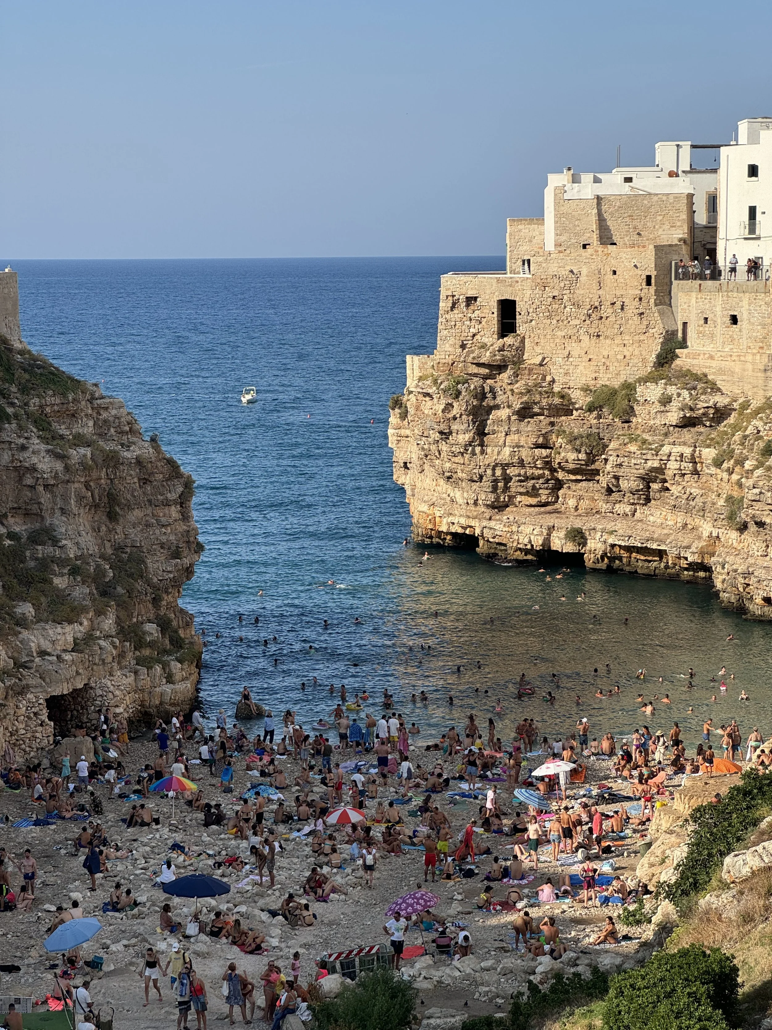 Perched high above electric-blue waters, Polignano a Mare is one of the most photogenic towns in Puglia. Whitewashed buildings cling to the cliffs, while locals linger over aperitivi like it’s an art form.